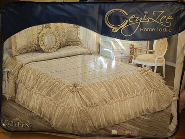 Şık yataq dəsti – atlas parça və zərif tüllə bəzədilmiş örtük və yastıq üzləri - Rəng: krem-şampan tonları, qızılı naxış və haşiyələr - Dizayn: iri çiçək aplikasiyaları, ətrafı incə bəzək tikişlər...