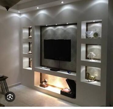 - TV stend/divar kompozisiyaları: TV üçün merkez panel, sağ-sol tərəflərdə nişlər, dekor üçün rəfli bölmələr. Hər nişdə nöqtə işıqları, alt hissədə LED xətti ilə vurğulama.