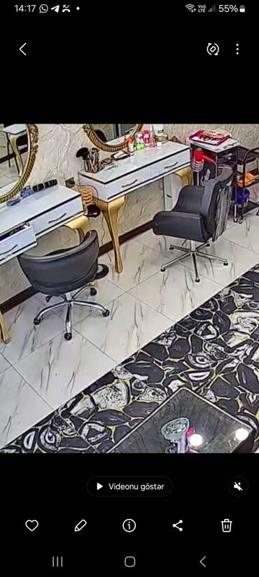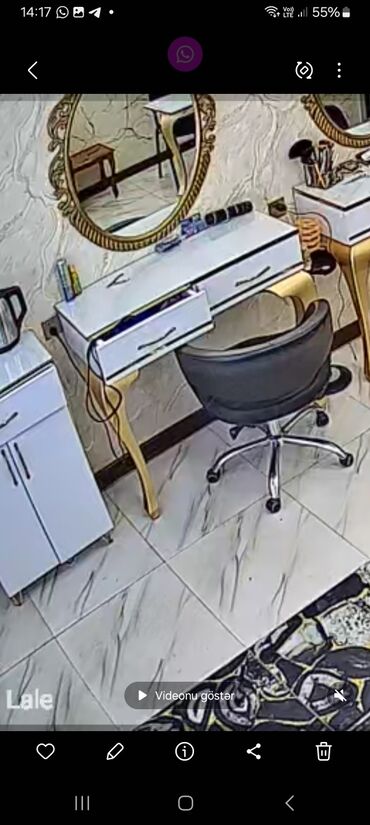 - 2 ədəd kosmetoloji/saç ustası masası: ağ rəng, şüşə üstlük, qızılı dekor ayaqlar, hər masada geniş saxlama üçün çekmecələr