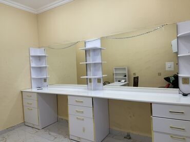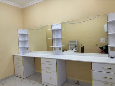 - Uzaqdan görünüşlü böyük divar güzgüsü boyunca uzanan 3 iş yeri: geniş ağ masaüstü, 3 bölməli yuxarı rəflər, hər iş yerində 3 çekmecəli tumba, qızılı tutacaqlar, iş yerlərinin yanında elektrik rozetkaları.