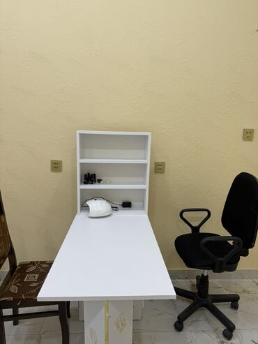 - Manikür üçün ayrıca masa: kompakt ölçülü ağ stol, arxa hissədə çoxsəviyyəli rəf bloku; yanında təkərli ofis kreslosu.