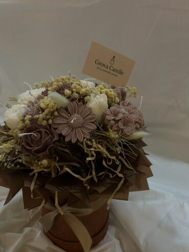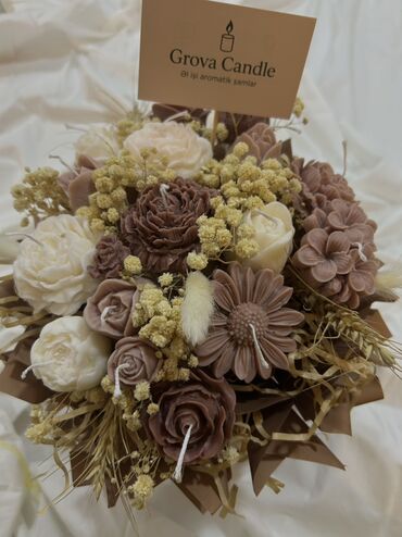 Grova Candle – əl işi aromatik şam buketi - Tərkib: Tamamilə əl işidir; müxtəlif çiçək formalarında hazırlanmış ətirli şamlar (gül, çobanyastığı, pion və s.) kompozisiya şəklində toplanıb. - Mater...