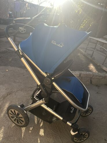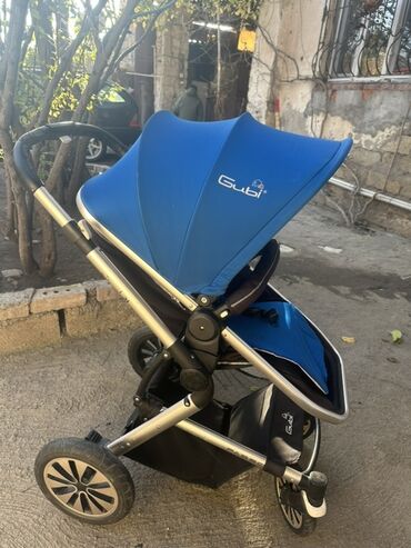 Uşaq arabası – Gubi (mavi) - Rəng: parlaq mavi kapot və oturacaq - Karkas: yüngül alüminium çərçivə - Təkərlər: 4 təkərli, ön təkərlər fırlanan, arxa təkərlər iri diametrli; ayaqla idarə olunan əy...