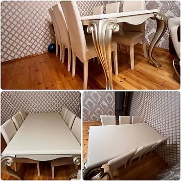 Möhtəşəm masa dəsti – yüksək keyfiyyətlə Komplekt: - Masa 2 m x 1 m - 6 ədəd stul Material və dizayn: - Masa: MDF, parlaq akril boyalı səth - Qalın 7-lik qubka konstruksiyası - Zərif qızılı dekor...