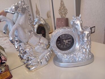 Gümüşü rəngli dekorativ saat və fiqur dəsti - Üslub: klassik/romantik, at tematikası - Komlekt: 2 dekor – biri analoq masa saati, digəri at fiquru - Saat: dairəvi qara siferblat, Roma rəqəmləri, “...
