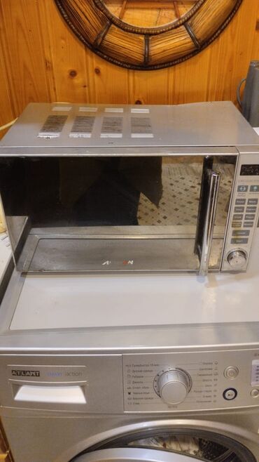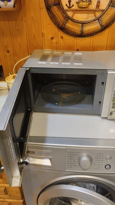 Mikrodalğalı soba – rəng: gümüşü/metallik, ön hissəsi güzgü effektli qapı və xrom tutacaqla. İdarəetmə paneli sağ tərəfdədir: rəqəmsal displey, proqram düymələri (Power, Micro, Grill, Combi, Defrost, Clock, Preset/Memory, Cancel/Stop, Start), həmçinin güc/süre tənzimləmə üçün fırlanan çarx mövcuddur. İç hissəsi işıqlıdır, şüşə fırlanan boşqab və üçayaqlı fırlanma mexanizmi ilə təchiz edilib. Üst paneldə çoxsaylı ventilyasiya yarıqları var. Standart masaüstü ölçü, mətbəx tezgahında və ya rəfdə istifadə üçün uyğundur. İstilik, qızartma (grill), kombinə olunmuş rejimlər və dondurulmuş məhsulların əridilməsi funksiyaları mövcuddur. Həm sürətli qızdırma, həm də vaxtlayıcı ilə dəqiq bişirmə imkanı verir. Plug-in şəbəkə kabeli ilə işləyir.