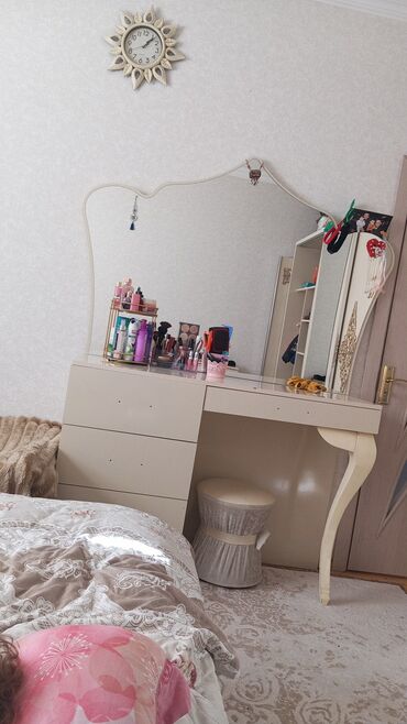 Bej rəngli modern tualet masası və güzgü dəsti - Parlaq bej tonlarda, minimalist dizayn - Geniş üst səth; makiyaj və gündəlik aksesuarlar üçün ideal - Böyük çərçivəli güzgü - Saxlama: solda 3 ədəd...