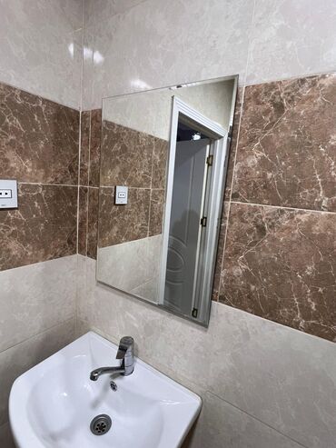 - Divar güzgüsü: düzbucaqlı forma, çərçivəsiz/minimalist dizayn, hamamın görünüşünü genişləndirən şəffaf səth.