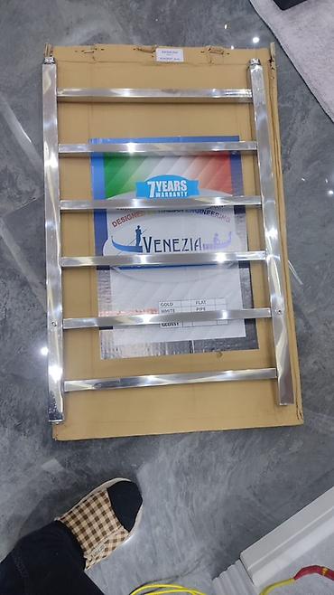 - Paslanmayan rels tipli dəsmal qızdırıcısı/asma rels: VENEZIA, 7 il qeyd olunan “warranty” stikeri, düz horizontal lamellər, parlaq xrom səth.