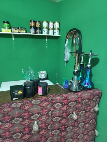 - Şişə və nərgilə guşəsi: müxtəlif tütün dadları üçün qutular/rəflər, nərgilə kolbaları və şlanqları üçün asqılar, hazırlıq masası.