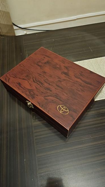 - Qırmızı-qəhvəyi tonlarda ağacdan hazırlanmış, içi yaşıl məxmər bəzəkli, qızılı kilidli qutu