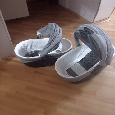 Ekizlər üçün kalyeska , rəngi boz və tünd göy rənglərinin qarışığıdır. Həm beşik kimi qışlıq otyracaqları var, həm də ayrıca yay üçün oturacaqları, açmaq , uzatmaq olur. Yağışlığı da var. birinci ə...