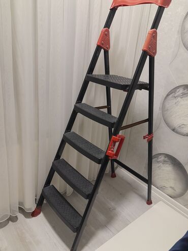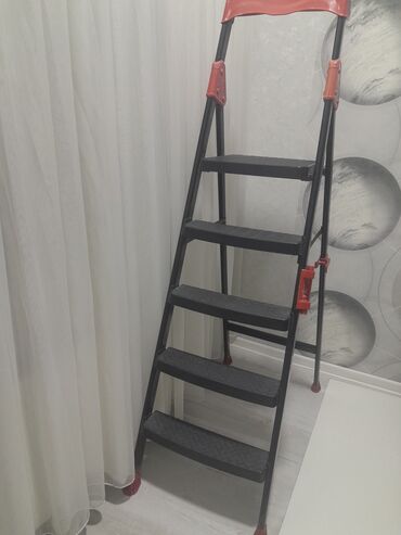 Bu, evdə və ya işdə müxtəlif tapşırıqlar üçün nəzərdə tutulmuş, altı pilləli, yüngül, ağ rəngli pilləkəndir. Pilləkən möhkəm alüminium çərçivəyə və qırmızı detallara malikdir. Pillələr sürüşməyən q...