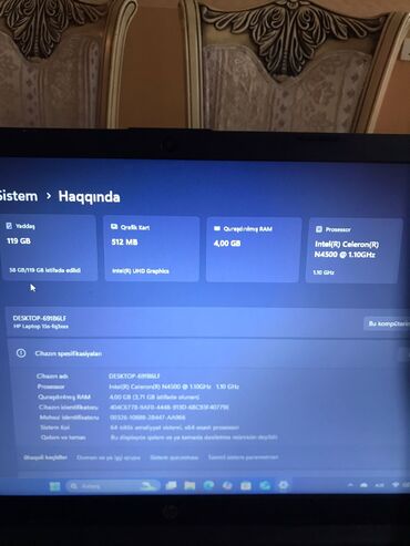 Hp notebook Model: *HP Laptop 15-ra0xx* - Prosessor: *Intel Celeron N3060 @ 1.60GHz* - RAM: *4GB (4096MB)* - Əməliyyat sistemi: Windows 10 Pro 64-bit