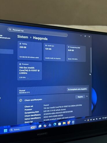 📍 Model: Huawei MateBook D15 ⚙️ Xüsusiyyətlər: Intel Core i5-10210U (10-cu nəsil) 8GB RAM 256GB SSD 15.6” Full HD ekran Orijinal Windows 11 lisenziyası aktivdir ✨ Noutbuk demək olar ki, istifadə o...
