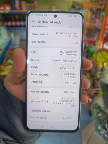 Huawei nova 13i – ağ rəngli, geniş ekranlı smartfon barter yalniz iphone 11pro Xüsusiyyətlər: - Model: HUAWEI nova 13i (EMUI göstərilir: 14.2.0, GPU Turbo) - Ekran: tam ekran dizayn, mərkəzdə “pu...