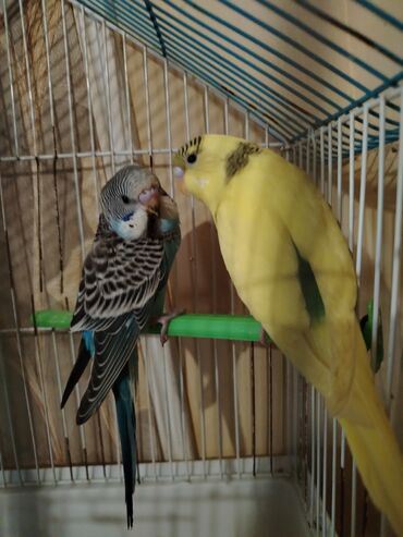 Nömrəli qəfəzdə iki dalğıç papağan (büdcəri) cütü. Xüsusiyyətlər: - Rənglər: biri tam sarı (lutino), digəri yaşıl-sarı, qara zolaqlı baş naxışları və mavi gaga üstü. - Növ: budgerigar (undulat). -...