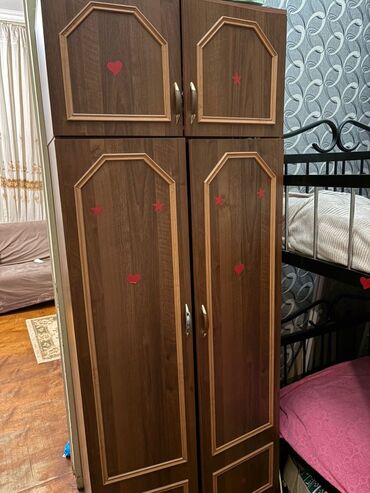 - Dolab: dörd qapılı, ağac fakturalı qəhvəyi rəng, klassik frezeli panellər, metal tutacaqlar. Üzərində dekorativ stikerlər var. Üst iki qapı ayrıca bölmədir, alt iki qapı isə əsas bölmə.