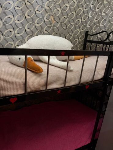 - Döşəklər: şəkldə iki döşək görünür (üst mərtəbədə krem rəngli örtü, alt mərtəbədə çəhrayı örtü).
