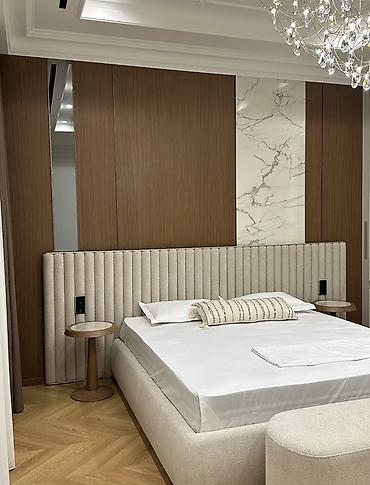 - İşıqlandırma: Tavan perimetri və nişlərdə gizli xətti işıq, həmçinin dekorativ asma çilçıraq – otağa bərabər və estetik işıq paylanması verir.
