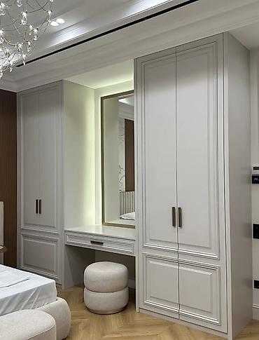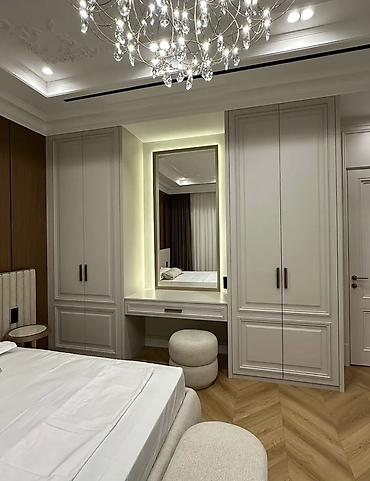 - İnteqrə edilmiş qarderob sistemi: İki böyük şkaf bölməsi, klassik frezli fasadlar, metal tutacaqlar. Aşağı hissədə geniş saxlama zonaları, üst hissədə paltar asma bölmələri.
