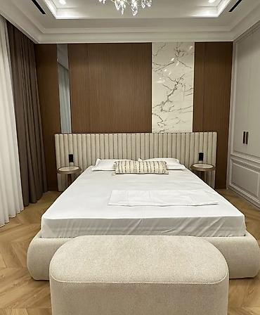 - Puf və skamyalar: Yumru puf (makiyaj masası üçün) və yataq ayaq tərəfində iri, yumşaq oturacaq skamya – rahat geyinmə və istirahət üçün.