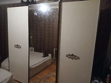 - Dolab: 3 qapılı sürgülü şkaf, orta qapı tam boy güzgülü, yan qapılarda dekorativ naxış. Ağ-krem tonlarda.