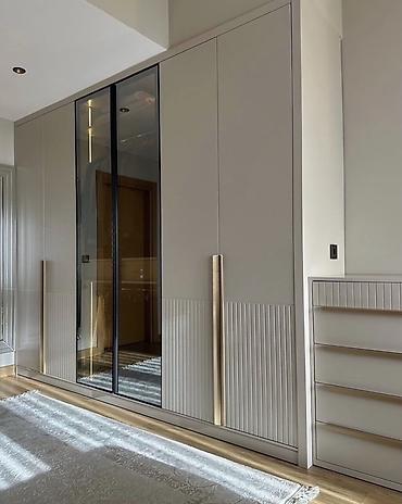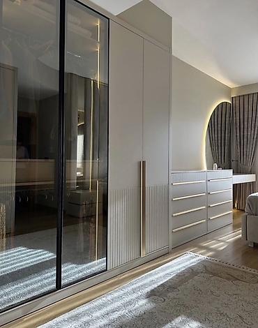 - 2 qapılı şkaf sistemi: tutqun krem rəngli fasadlar + tünd şüşə vitrin qapılar, uzun qızılı tutacaqlar, içəridə asılqan və rəf bölmələri, daxili LED işıqlandırma
