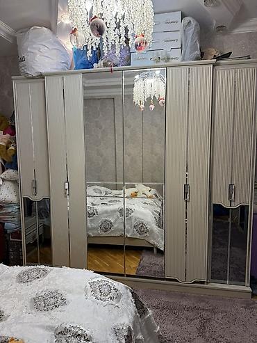 - 6 qapılı geniş paltar şkafı: mərkəzdə tam boy güzgülü qapılar, yanlarda şaquli relyefli panellər və asma paltar, rəf və bölmələr üçün çoxlu yer.