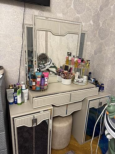 - Tualet masası-güzgü: geniş üst səth, böyük mərkəzi güzgü və əlavə yan güzgülər; yuxarı çekmece və aşağıda 2 bölməli dolablarla saxlama imkanı; alt hissədə oturacaq üçün yer.