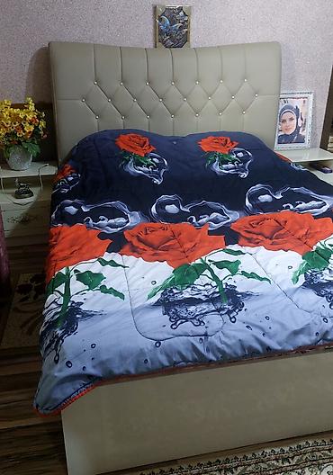 - Geniş yumşaq başlıqlı iki nəfərlik çarpayı (zəhmətsiz təmizlənən, düyməli kapitone başlıq). Döşək üzərində qızılgül naxışlı qalın yorğan/örtük.