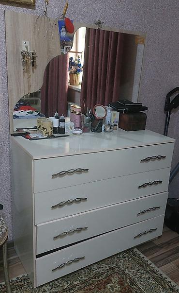 - Komod-tualet masası: üstündə böyük, fiqurlu kənarlı güzgü; 4 geniş çekmece, dalğavari tutacaqlar. Gündəlik kosmetika və aksessuarların səliqəli yerləşdirilməsi üçün rahatdır.