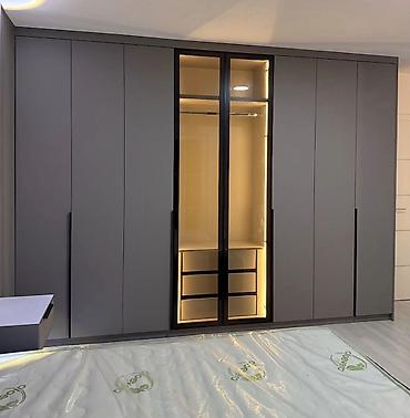 - Geniş qarderob sistemi: çoxqanadlı dolab, mərkəzdə şüşə vitrin qapıları və daxili isti LED işıqlandırma; asılqan zonası, rəflər və çekmecələr.