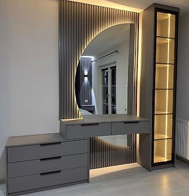 - Tualet masası/dresser: 2 çekmecəli üst modul və 3 çekmecəli alt modul; iri dairəvi güzgü arxadan LED işıqlandırma ilə; şüşə qapılı vitrinli yan modul, tənzimlənən şüşə rəflər.