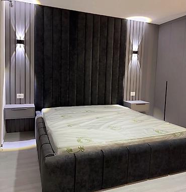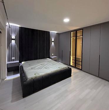 - Yumşaq başlıqlı, parça ilə üzlənmiş iri çarpayı karkası. Hündür, panelli başlıq divar dekoru ilə birləşir, yanlarda inteqrasiya olunan LED işıqlar.