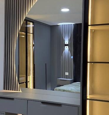 - İşıqlandırma: divar aplikləri, güzgü və dolab daxilində LED lentlər – yumşaq, isti ton.