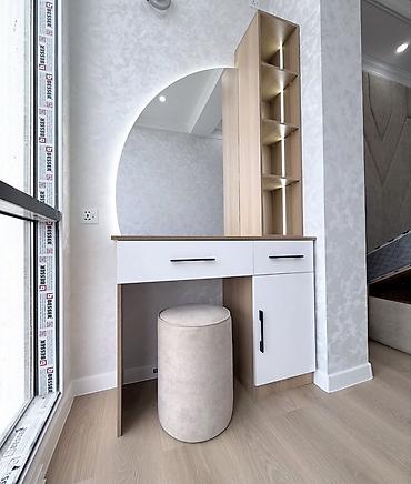 - Vizaj masası: iki çekmece + qapılı bölmə; LED işıqlı açıq rəf bloku; böyük yarımdairəvi güzgü; uyğun puf oturacaq.