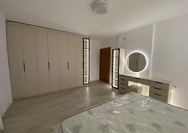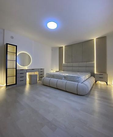 Müasir yataq otağı mebel dəsti Tərkib: - Yumşaq başlıqlı, geniş ölçülü çarpayı karkası (parça üzlü, vertikal dekor tikişli başlıq, alçaq ayaqlı, ətrafı yumşaq bordürlü). - 2 ədəd tumba: hər birind...