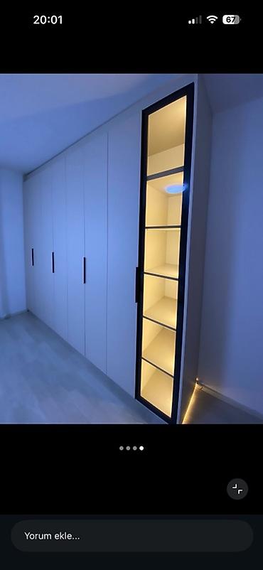 - Geniş dolab sistemi: çoxqanadlı qapılar, qara tutacaqlar, bir tərəfdə şüşə qapılı vitrinqəbli modul və daxili LED işıqlandırma, çoxsəviyyəli rəflər