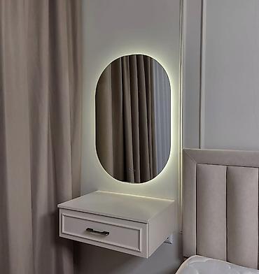 - Divara bərkidilən tualet masası: bir çekmecəli konsol tipli masa və arxadan işıqlanması olan oval güzgü (toxunma düyməsi görünür).