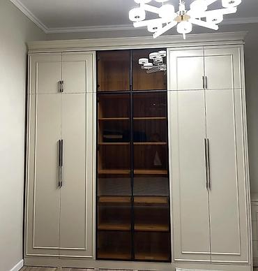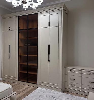- Geniş qarderob: iki yan hissəsi qapalı, mərkəz hissəsi şüşə qapılı vitrin şəklində, içəridə taxta rəflər. Uzun metal tutacaqlar.