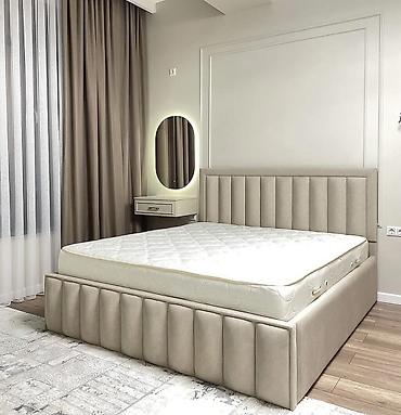 - Yumşaq başlıq və ətəklikli, parça ilə üzlənmiş iri çarpayı. Dikey panellərlə dizayn olunmuş başlıq, çərçivə boyunca eyni üslubda dekorativ tikişlər. Qalın ortopedik döşək üstündədir.
