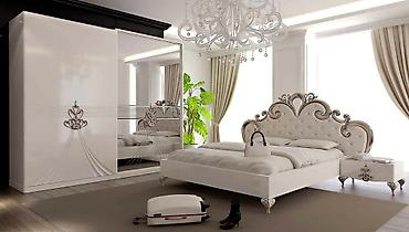 - 1 ədəd çarpayı – yumşaq, düyməli başlıq (kapitone), qabarıq barokko naxışlı çərçivə; alt hissə açılan mexanizmlidir və döşəkaltı əlavə saxlama sahəsi verir.