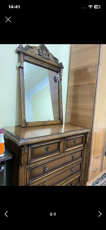 - Komod + güzgü – üst hissəsi geniş, 6 çekmecəli (2 yuxarı kiçik, 4 iri), üstündə dekorlu çərçivəli dikdörtgen güzgü.