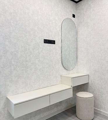 - Vizaj/iş masası zonası: Divara bərkidilən asma konsol – uzun iş səthi və 2 çekmece; ayrıca küncdə kvadrat formalı kiçik konsol. Dayaq kimi yumru, yumşaq puf. Divarda iri oval güzgü.