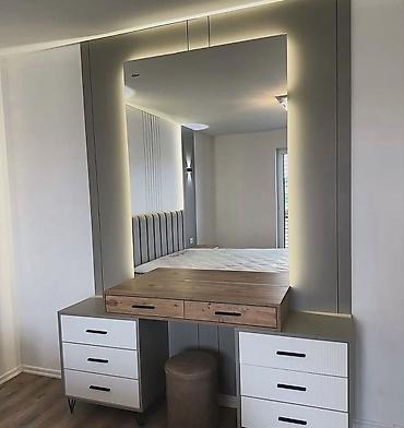- Güzgülü makiyaj masası: iri işıqlı LED çərçivəli güzgü, üst hissə ağac teksturalı masa, iki tərəfdə 3+3 çekmece, qara tutacaqlar; altına oturacaq üçün boşluq.