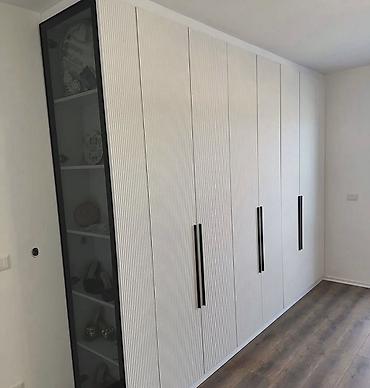 - Geniş qarderob şkafı: ağ rəngli lamell effektli qapılar, uzun qara tutacaqlar; bir tərəfdə şüşəli vitrin bölməsi və rəflər.