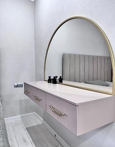 - Tualet masası: divara montajlı, 3 çekmecəli, qızılı çərçivəli böyük yarımdairə güzgü. Metal dekorlu tutacaqlar, gündəlik makiyaj və aksesuarlar üçün rahat iş səthi.