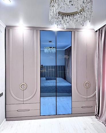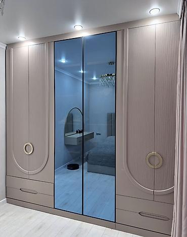 - Geniş qarderob: 4 bölməli konstruksiya, mərkəzdə tünd tonlu güzgülü sürgülü/qanatlı qapılar, yanlarda dekorativ relyef panellər, iri halqa formalı tutacaqlar. Aşağıda əlavə çekmecələr. Asılqan üçün ştanqlar, rəflər və qutu bölmələri ilə səliqəli saxlama imkanı.