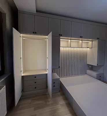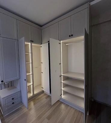 - Divardan-divara quraşdırılan modullu dolab sistemi: yuxarı bölmələr, asılqanlı bölmələr, çekmecələr və geniş rəfli hissələr